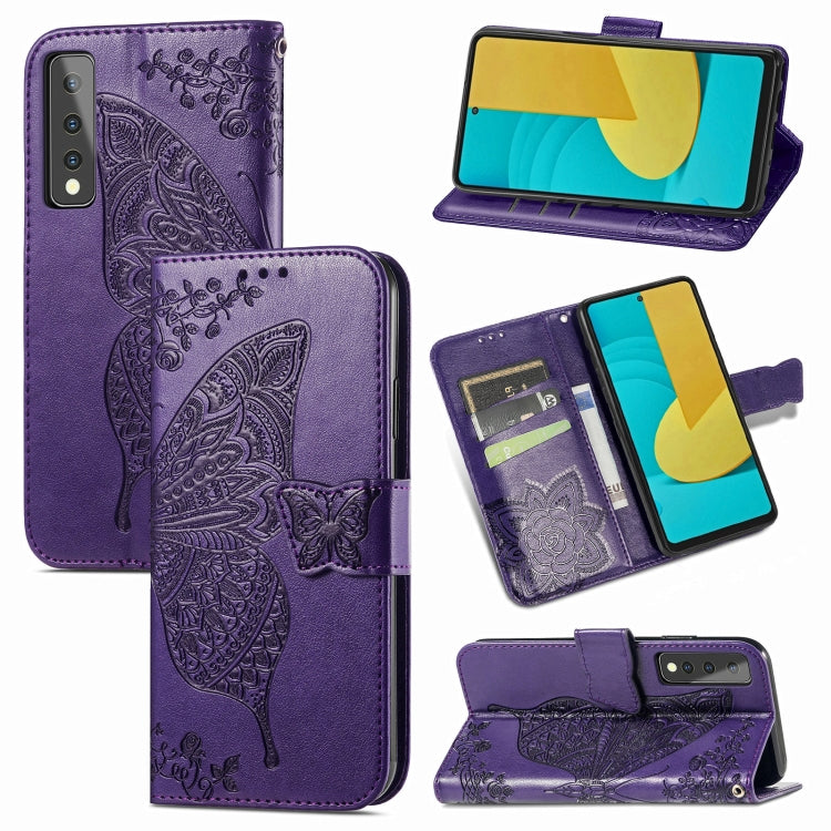Funda de Cuero Horizontal para LG Stylo 7 Butterfly Love Flowe con Soporte, Tarjeta Slot, Wallet y Lanyard (Dark Purple)