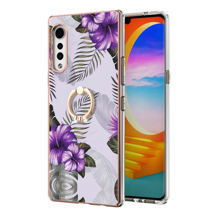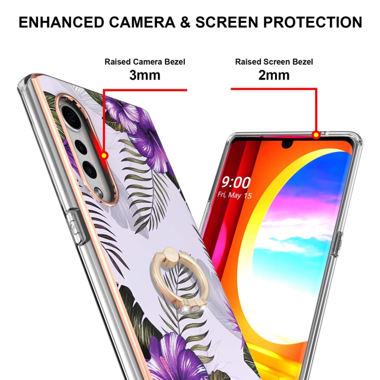 Funda TPU LG Velvet 4G / Velvet 5G / G9 con Patrón Galvanoplastia, Soporte Anillo y Diamantes (Flor Morada)