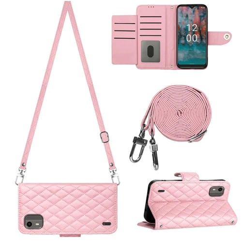 Funda de Cuero para Nokia C12 con Tapa, Textura Rómbica y Cordón Largo (Rosa)