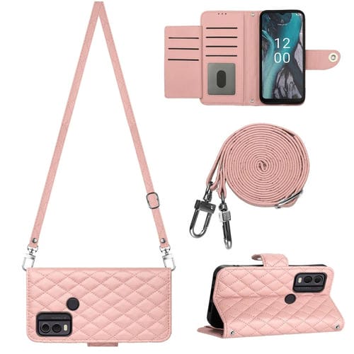 Funda de Cuero para Nokia C22 con Tapa, Textura Rómbica y Cordón Largo (Rosa Coral)