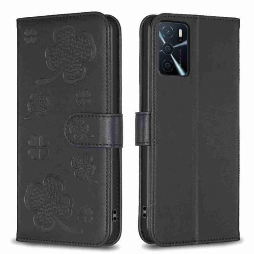 Para Oppo A16 / A16S / A54S Funda para Teléfono de Cuero con Relieve de Cuatro Hojas (Negro)