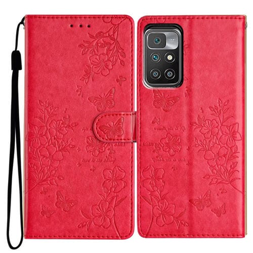 Para Redmi 10 Funda de Cuero para Teléfono con Mariposas y Flores (Rojo)