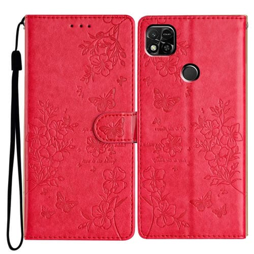 Para Redmi 10A Funda de Cuero para Teléfono con Mariposas y Flores (Rojo)
