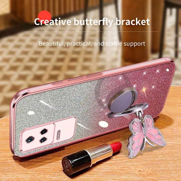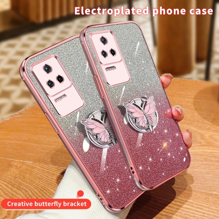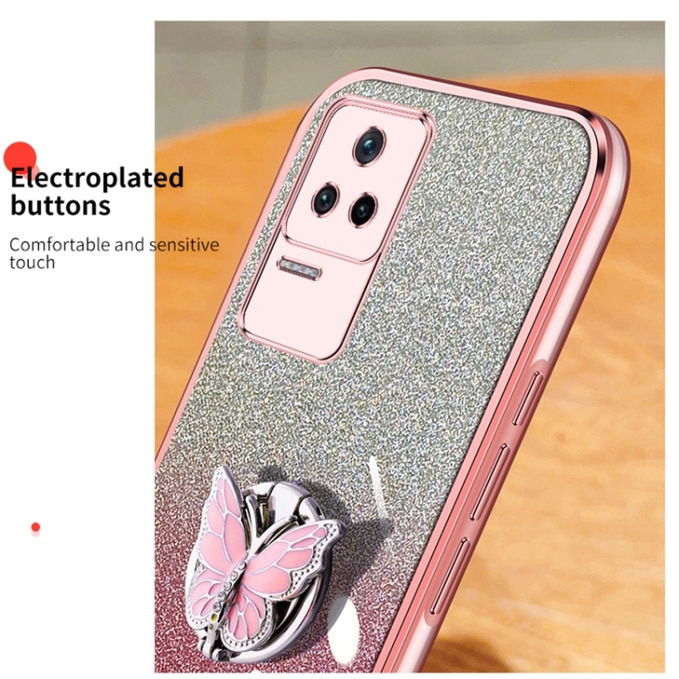 Para Redmi K40S Funda para Teléfono de TPU con Soporte de Mariposa con Brillo Degradado Plateado (Rosa)