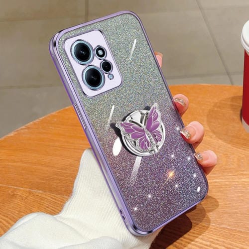 Para Redmi Note 12 4G Funda para Teléfono de TPU con Soporte de Mariposa con Brillo Degradado Global Plateado (Púrpura)