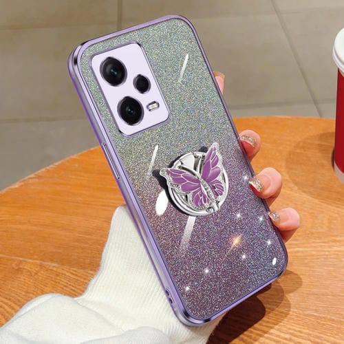 Para Redmi Note 12 Pro + Funda para Teléfono de TPU con Soporte de Mariposa con Brillo Degradado Plateado Global (Púrpura)