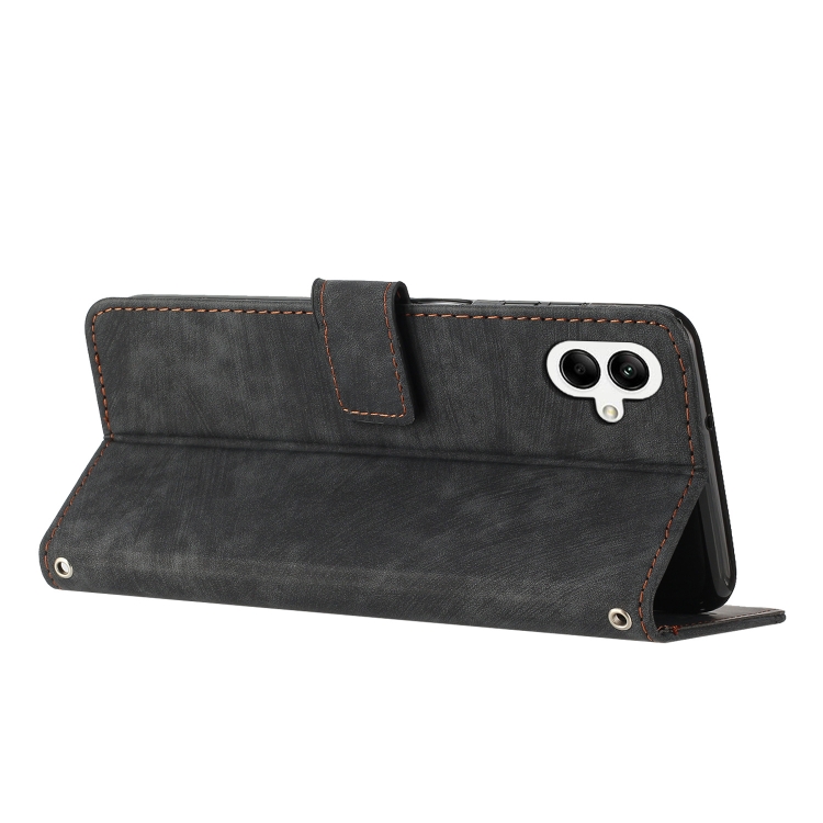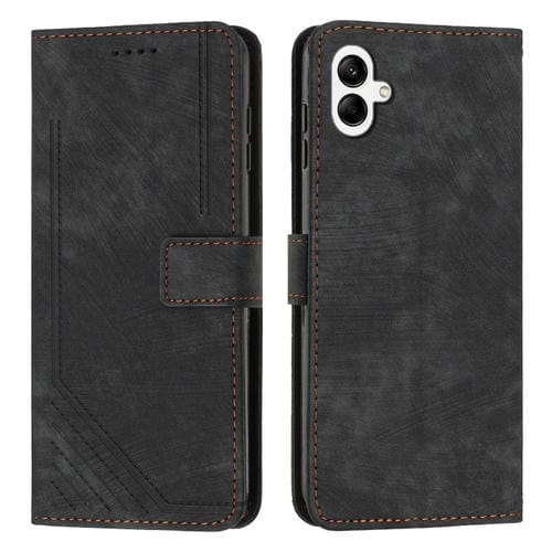Funda de Cuero Samsung Galaxy A05 Skin Feel con Patrón de Rayas y Cordón (Negro)