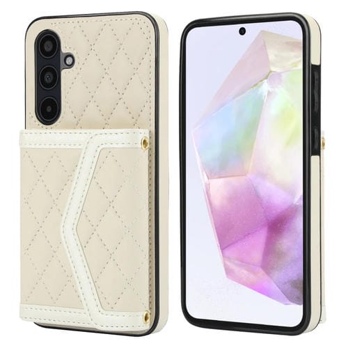 Estuche para Teléfono Samsung Galaxy A35 5G con Bolsa para Tarjetas Textura Rómbica y Cordón Largo (Beige)