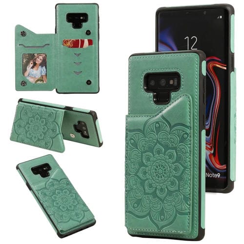 Estuche protector Samsung Galaxy Note 9 Flor patrón relieve a prueba de golpes con soporte y ranuras para tarjetas (Verde)