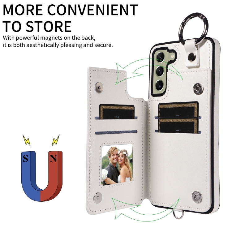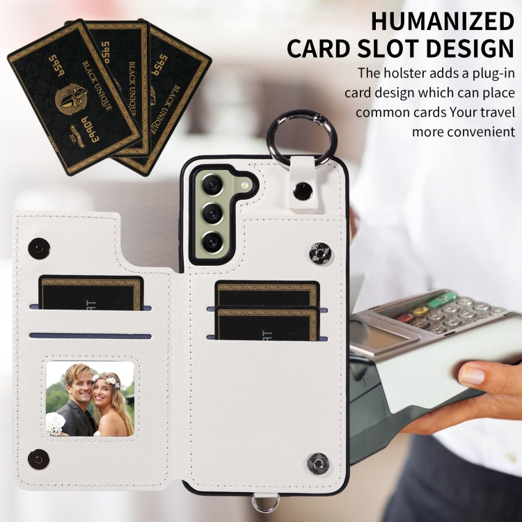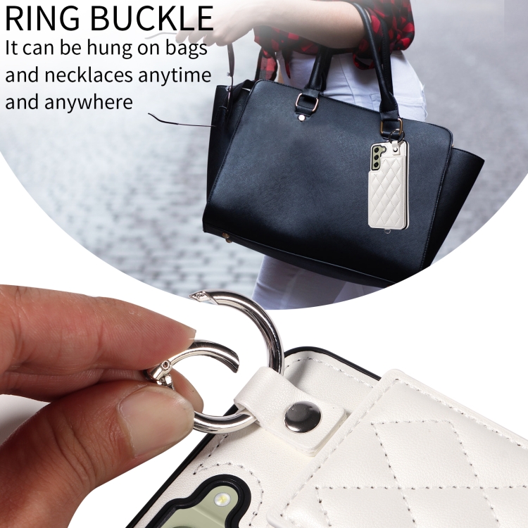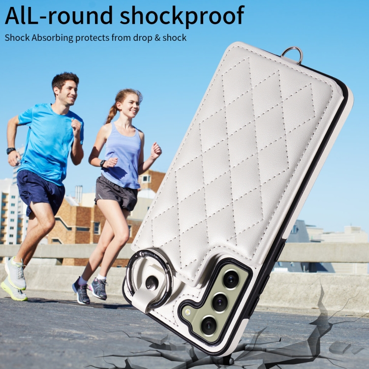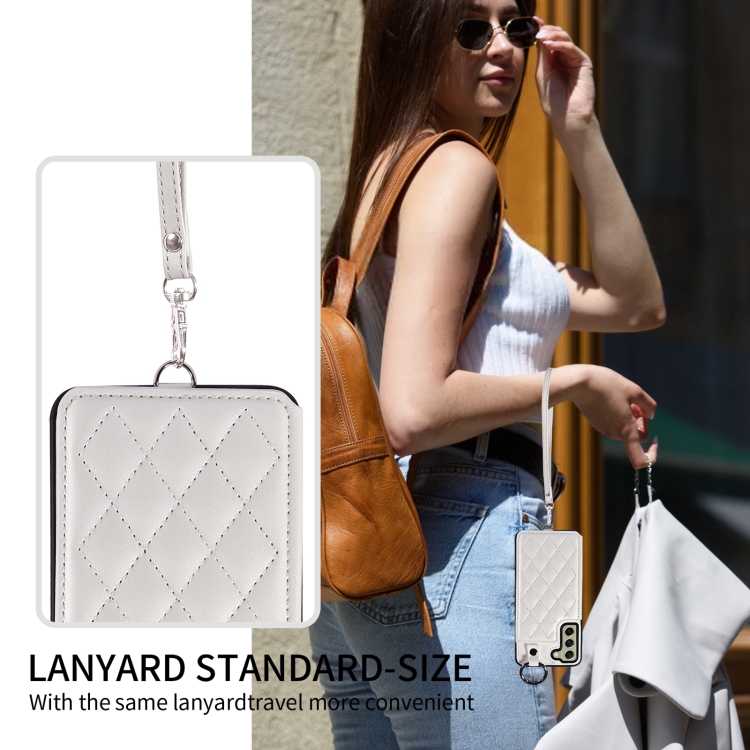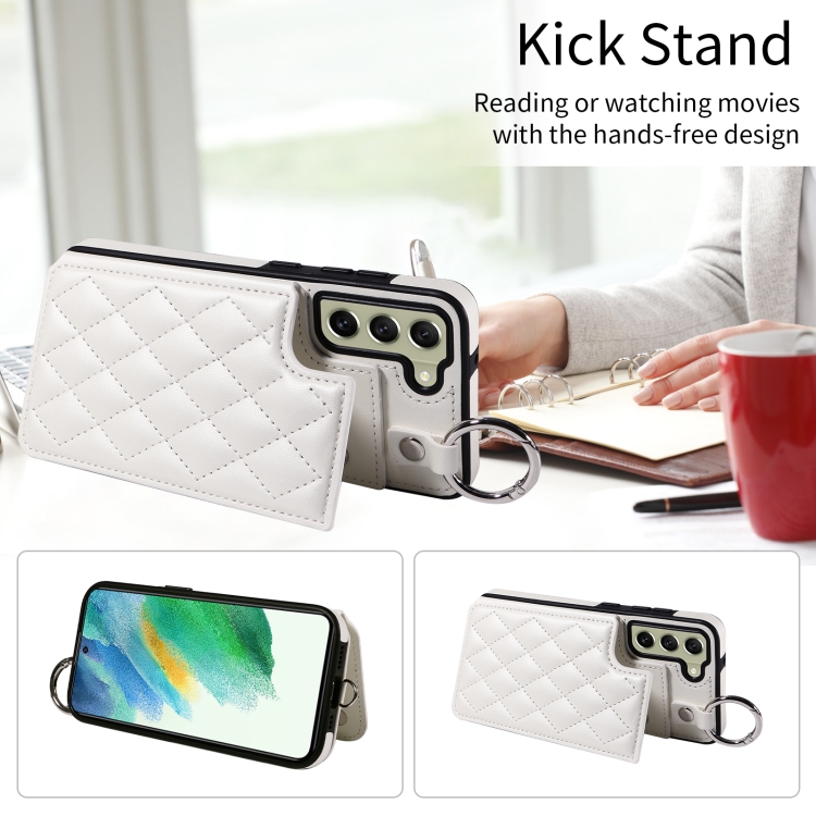 Estuche para Samsung Galaxy S21 FE 5G con Bolsa para Tarjetas Textura Rómbica y Cordón Corto (Blanco)