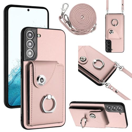 Funda para Teléfono Samsung Galaxy S21 FE 5G con Soporte para Anillo y Bolsa para Tarjeta con Cordón Largo (Rosa)
