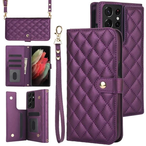 Estuche para Teléfono Samsung Galaxy S21 Ultra 5G Crossbody Cuero Rómbico Multifunción (Púrpura Oscuro)