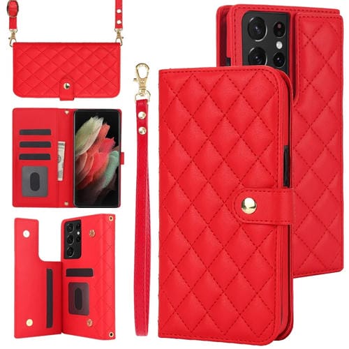 Estuche para Teléfono Samsung Galaxy S21 Ultra 5G Crossbody Cuero Rómbico Multifunción (Rojo)