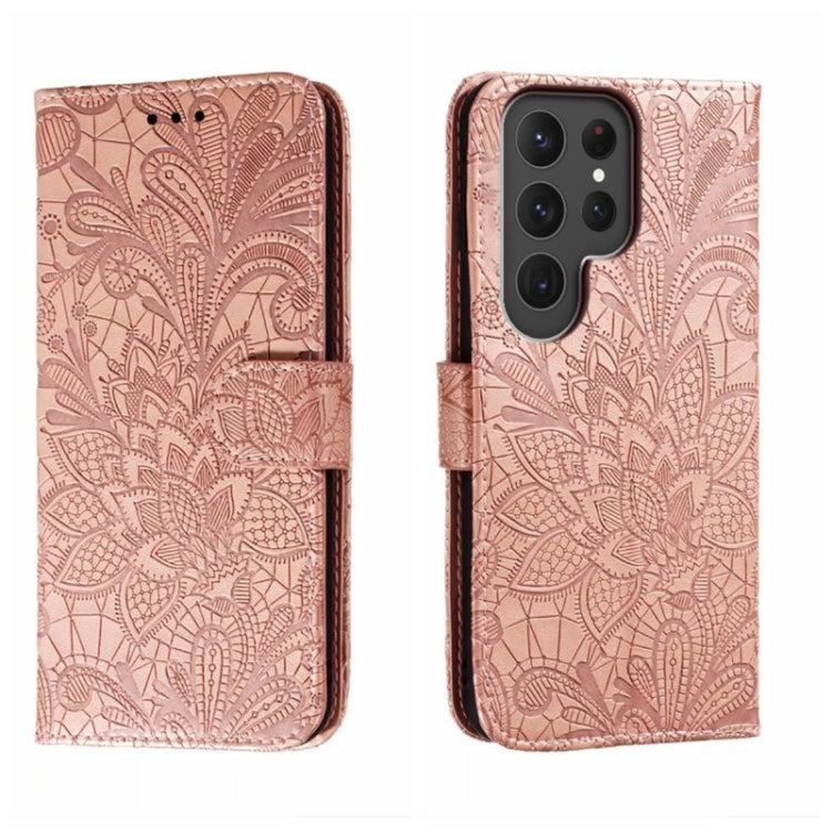 Para Samsung Galaxy S23 Ultra 5G Flor de encaje en relieve Flip Funda de cuero para teléfono (Oro rosa)