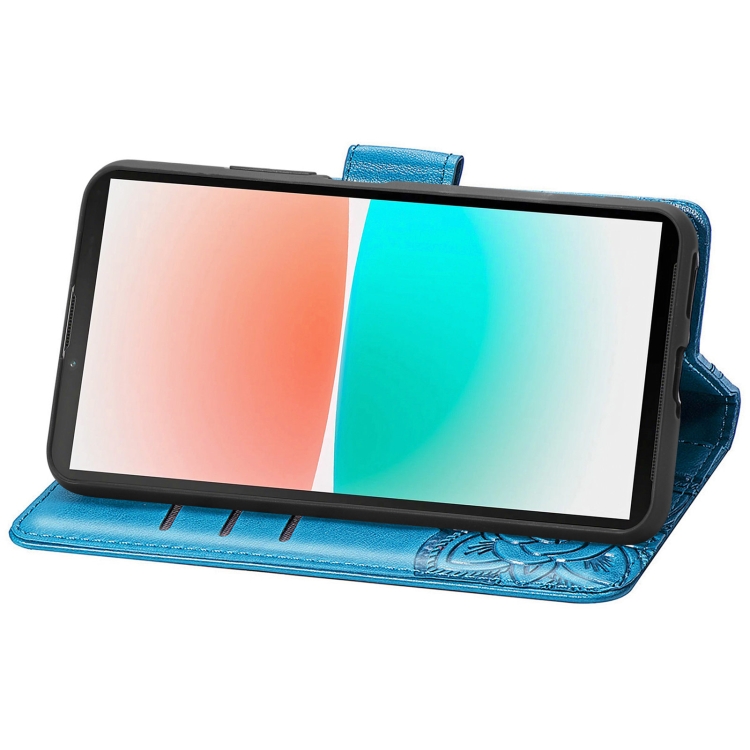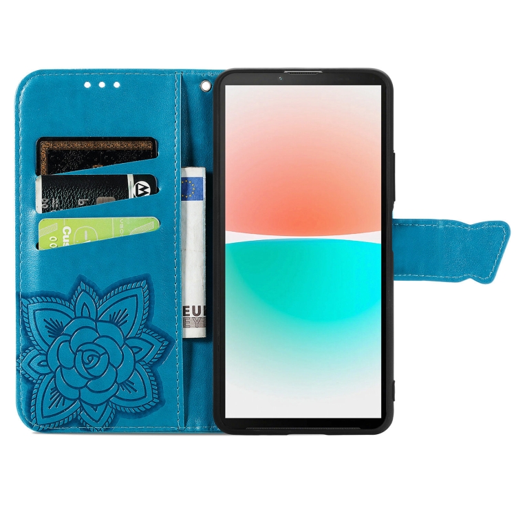 Estuche para Sharp Aquos R8 Butterfly Love Flower en Cuero En Relieve (Azul)