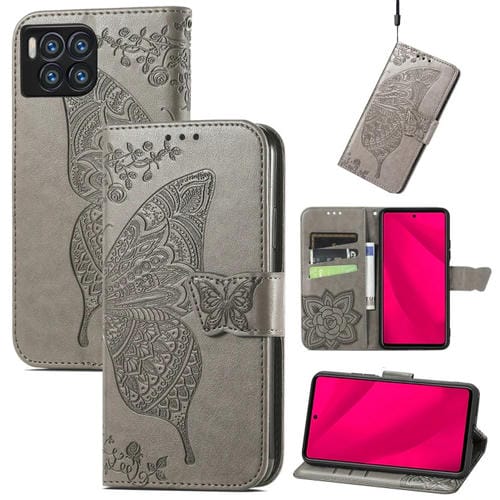 Funda para T-Mobile Revvl 7 Pro 5G de Cuero con Relieve Flor y Mariposa (Gris)