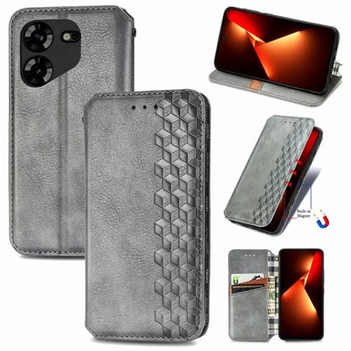 Funda de Teléfono Tecno Pova 5 4G Cubic Grid Cuero Magnético Prensado (Gris)