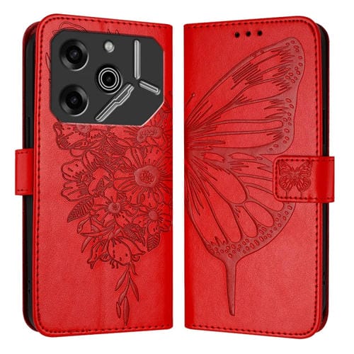 Funda de Cuero para Tecno Pova 6 5G con Mariposa en Relieve (Rojo)