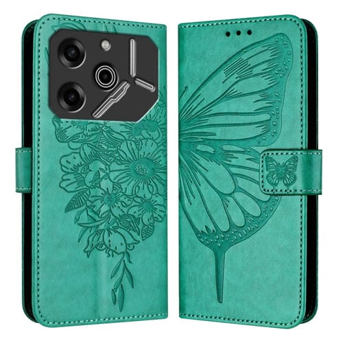 Funda de Cuero para Tecno Pova 6 Pro con Mariposa en Relieve (Verde)