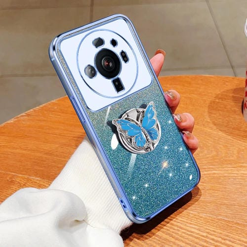 Para Xiaomi 12S Funda para Teléfono de TPU con Soporte de Mariposa con Brillo Degradado Ultra Plateado (Azul Sierra)