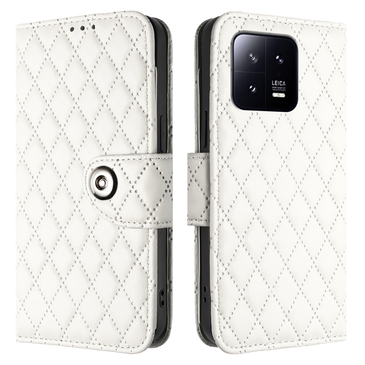 Para Xiaomi 13 Funda de Cuero con Tapa con Textura Rómbica y Cordón (Blanco)