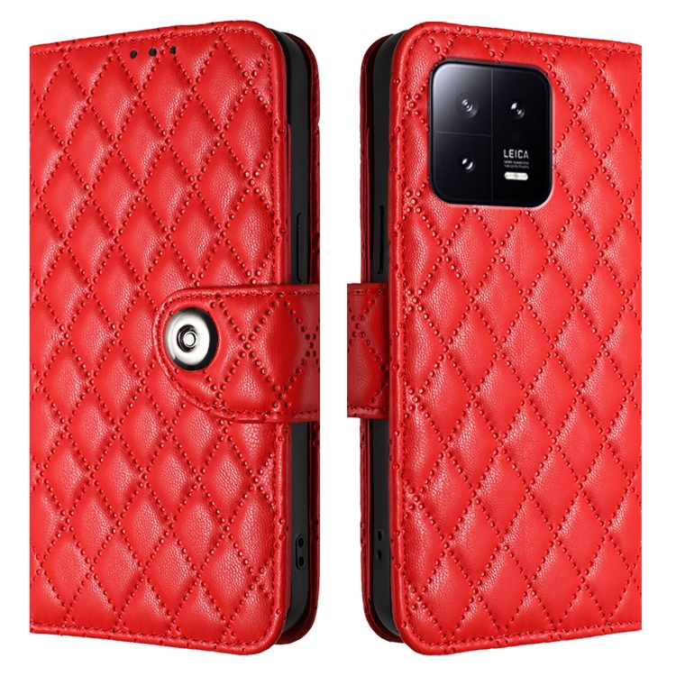 Para Xiaomi 13 Funda de Teléfono de Cuero con Tapa con Textura Rómbica y Cordón (Rojo)