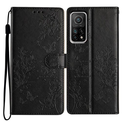 Para Xiaomi Mi 10T 5G Funda de Cuero para Teléfono con Mariposas y Flores (Negro)