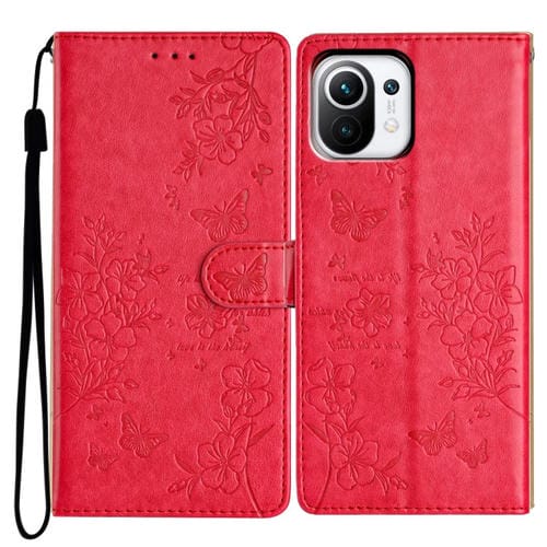 Para Xiaomi Mi 11 Lite Funda de Cuero para Teléfono con Mariposas y Flores (Rojo)
