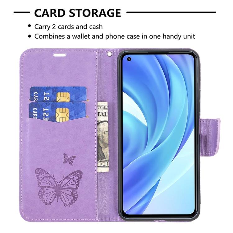 Para Xiaomi Mi 11 Lite Grabar En Relieve Dos Mariposas Patrón Funda de Cuero de Pu Horizontal Flip Pu con Soporte y Ranura para Tarjeta y Billetera y Cordón (Púrpura)