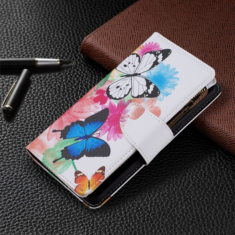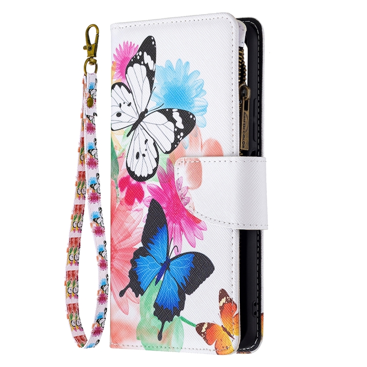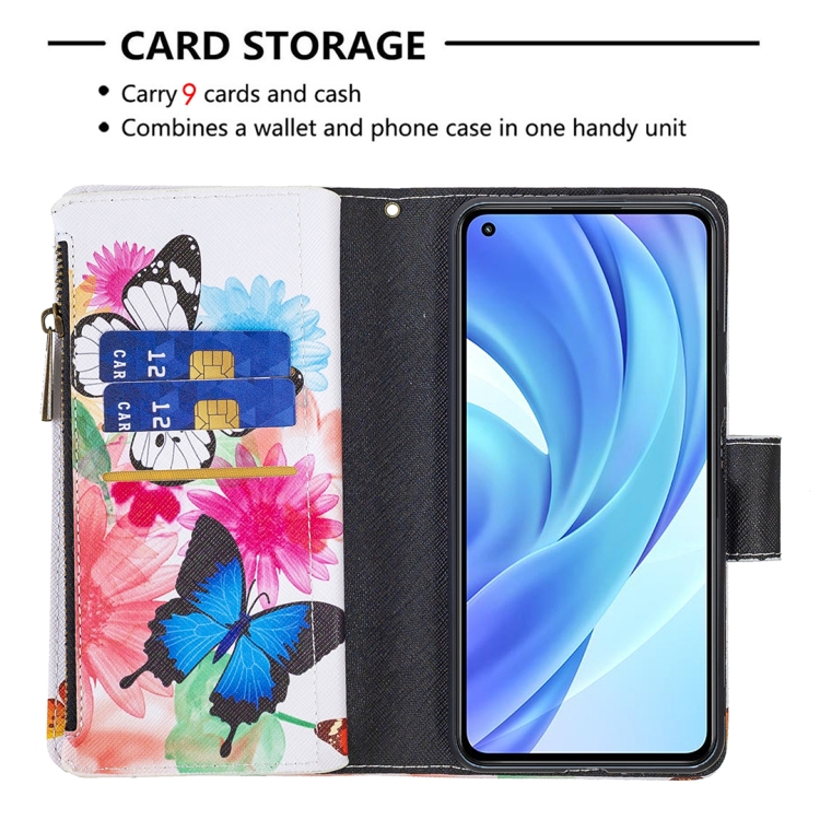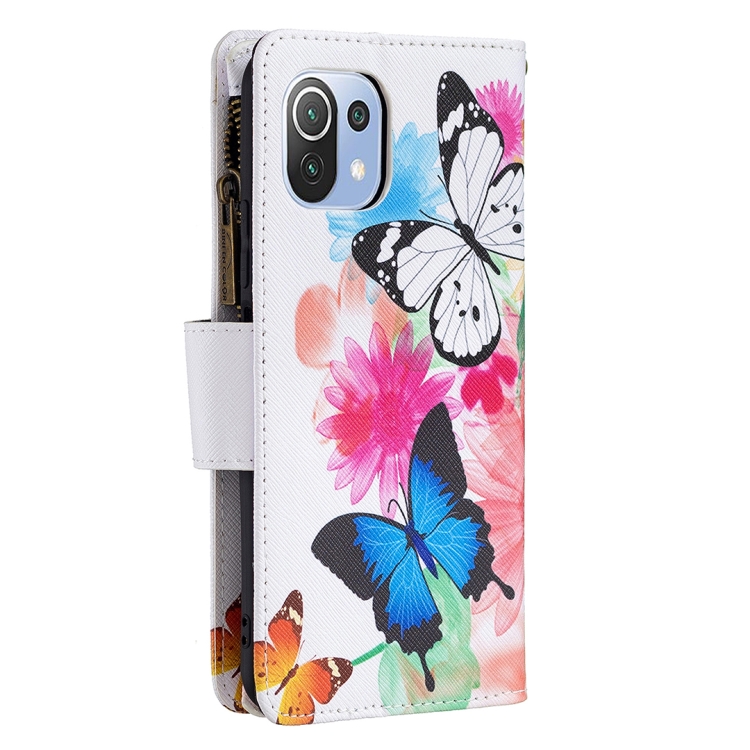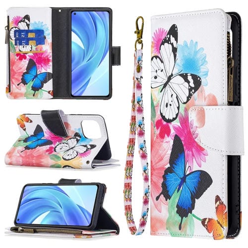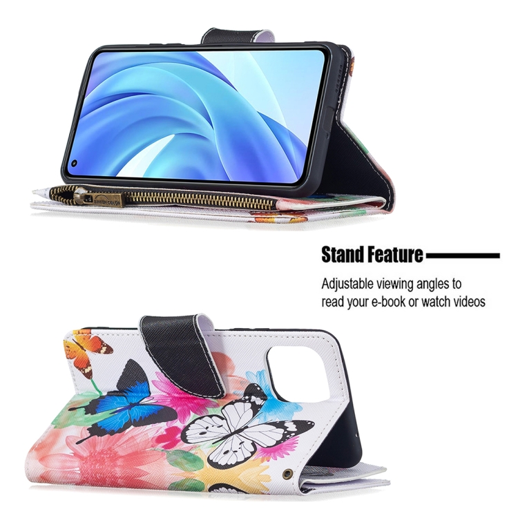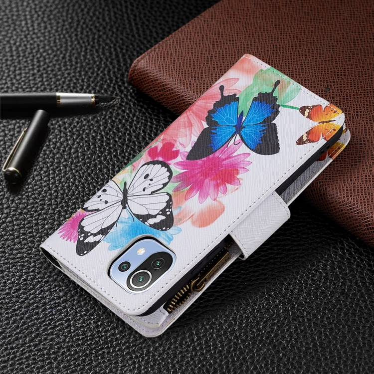 Para Xiaomi Mi 11 Lite Patrón de Dibujo de Color con Cremallera Caja de Cuero de Flip Horizontal con Soporte y Tragamonedas y Billetera (Dos Mariposas)