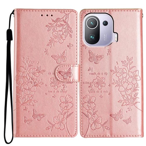 Para Xiaomi Mi 11 Pro Funda de Cuero para Teléfono con Mariposas y Flores (Oro Rosa)