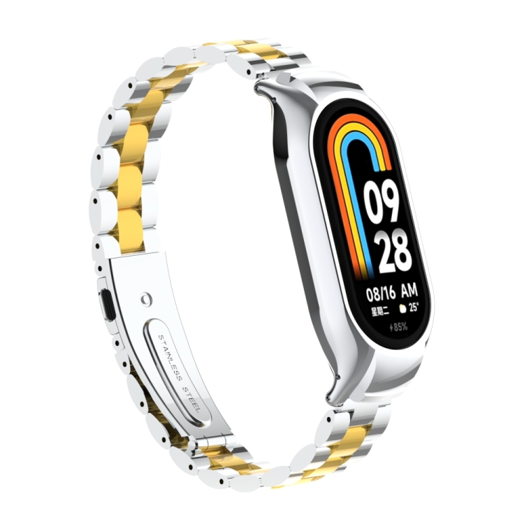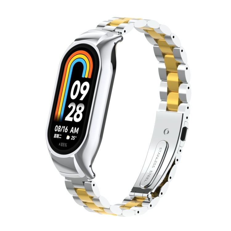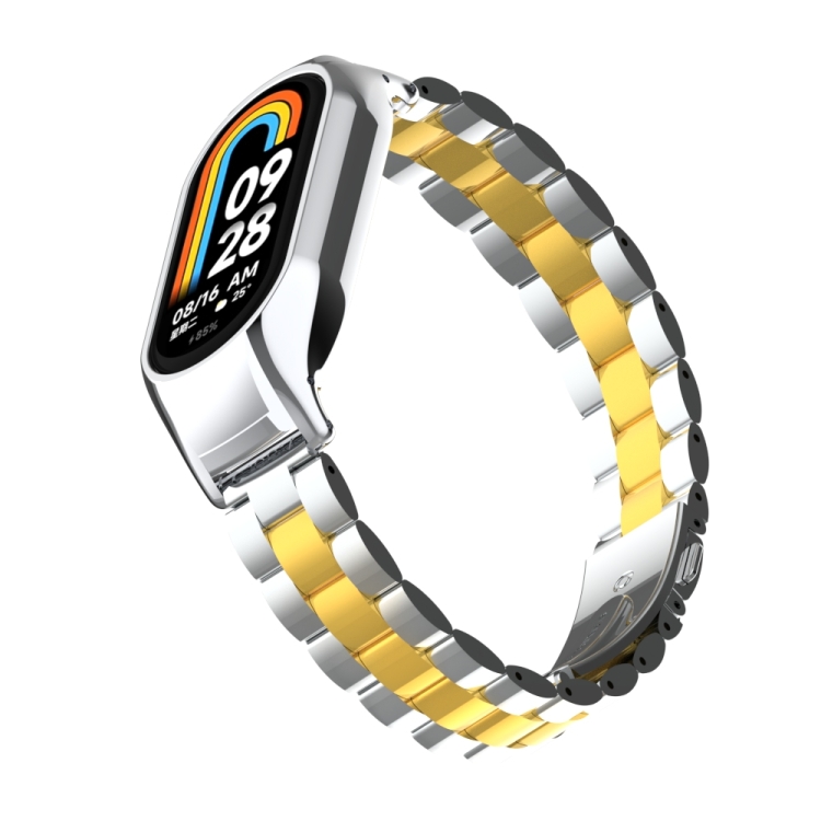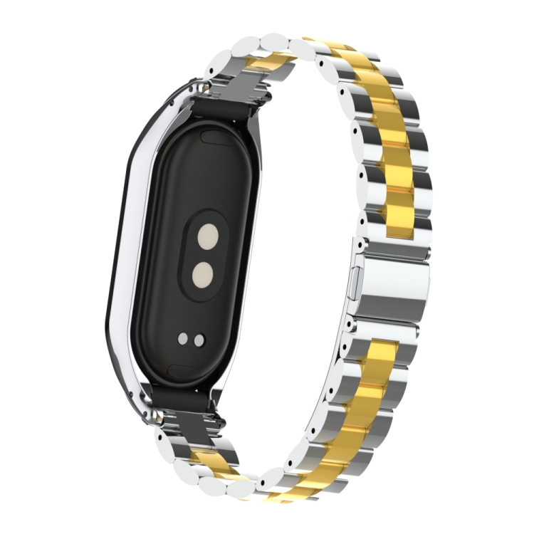 Caja de Metal integrada para Xiaomi Mi Band 8 + Correa de Reloj de Tres Cuentas (Plata y Oro)