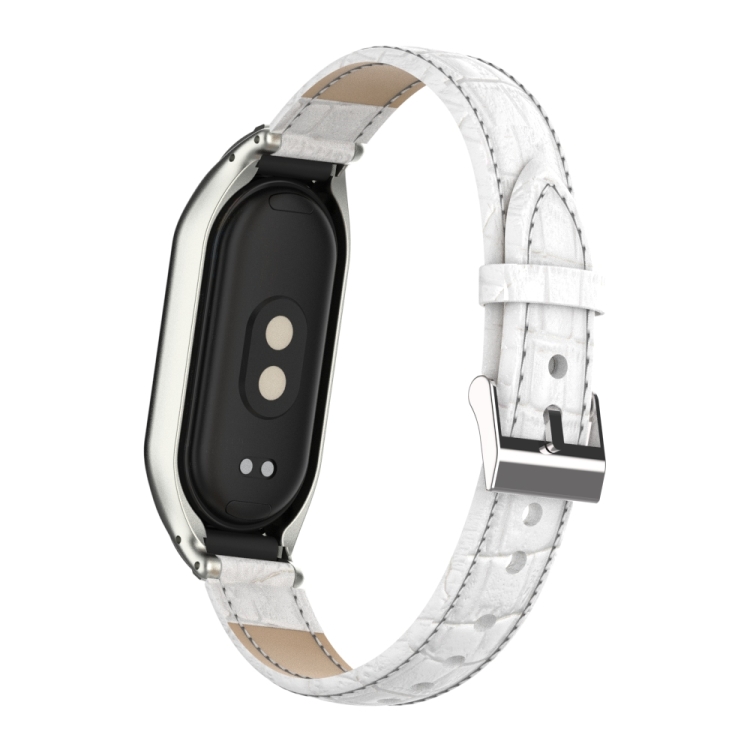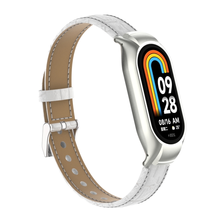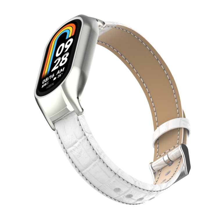 Estuche de Metal Integrado y Correa de Cuero para Xiaomi Mi Band 8 (Blanco)