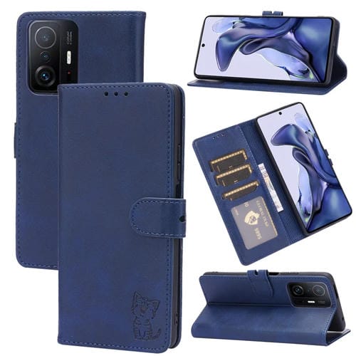 Para Xiaomi Redmi 10 Estampado de Gato Feliz En Relieve Caja de Cuero Horizontal con Soporte y Tragamonedas y Billetera (Azul)