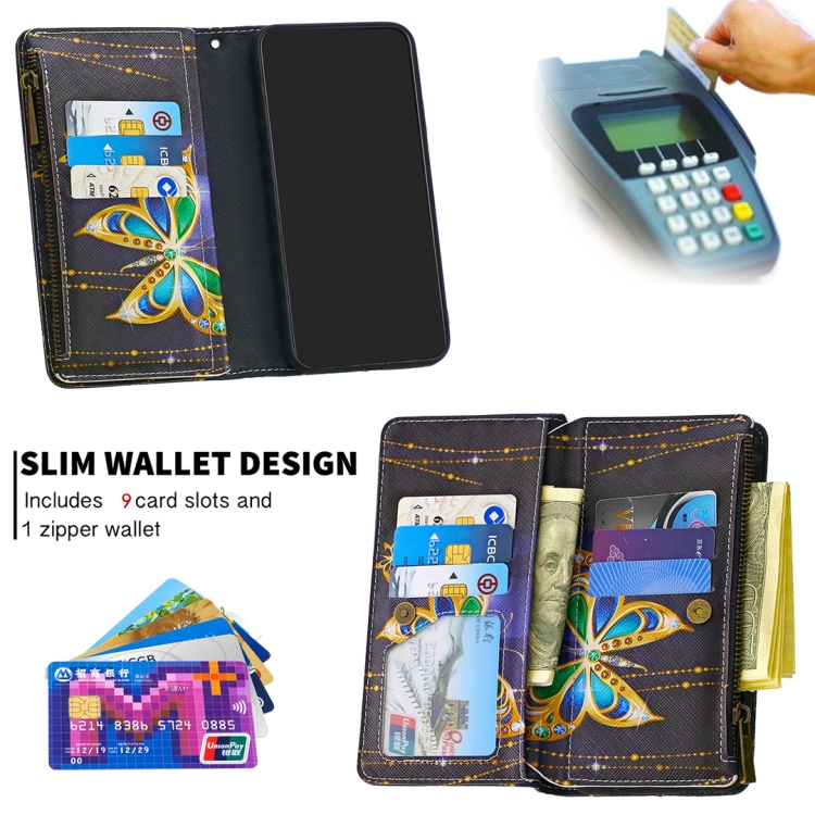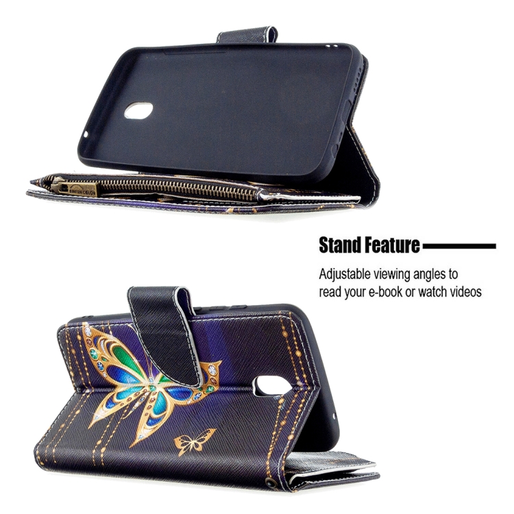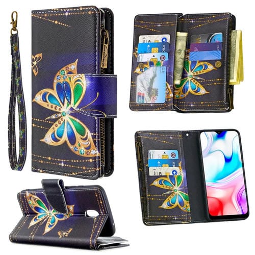 Para Xiaomi Redmi 8A Patrón de Dibujo de Colores Cremallera Funda de Cuero con Tapa Horizontal con Soporte y Ranuras para Tarjetas y Billetera (Mariposa Grande)