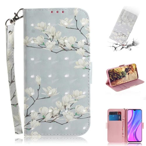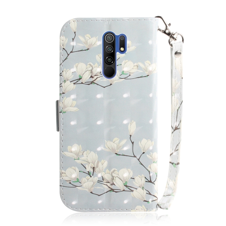 Para Xiaomi Redmi 9 3D Patrón Pintado Atracción Magnética Funda de Cuero con Tapa Horizontal con Soporte y Ranura para Tarjeta y Billetera y Cordón (Magnolia)
