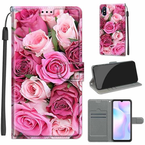 Para Xiaomi Redmi 9A Dibujo de Color de Voltaje Cierre Magnético Horizontal Flip Pu Funda de Cuero con Soporte y Ranuras de Tarjetas (C17 Hoja Verde Rosa Rosa)