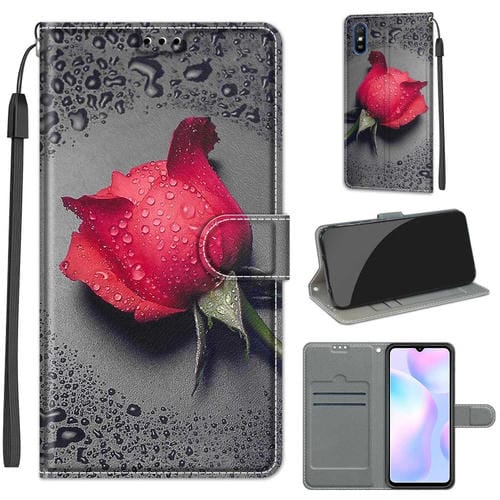 Para Xiaomi Redmi 9A Dibujo de Color de Voltaje Cierre Magnético Horizontal Flip Pu Funda de Cuero con Soporte y Ranuras para Tarjetas (C14 Black Water Drop Rose)