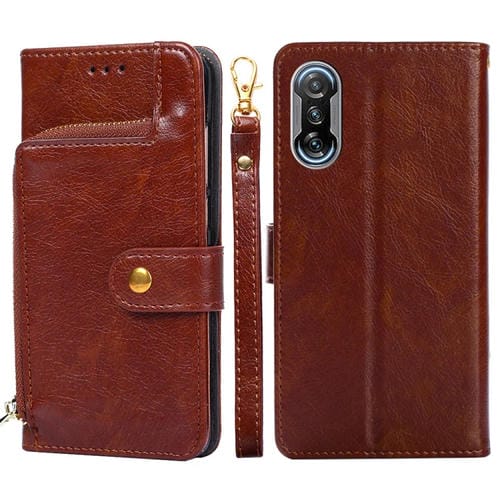 Para Xiaomi Redmi K40 Gaming Zipper Bag Horizontal Flip de Cuero con Titular y Ranuras para Tarjetas y Cordón (Marrón)