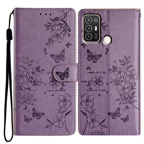 Funda para ZTE Blade A52 de Cuero con Relieve de Flor y Mariposa (Púrpura)