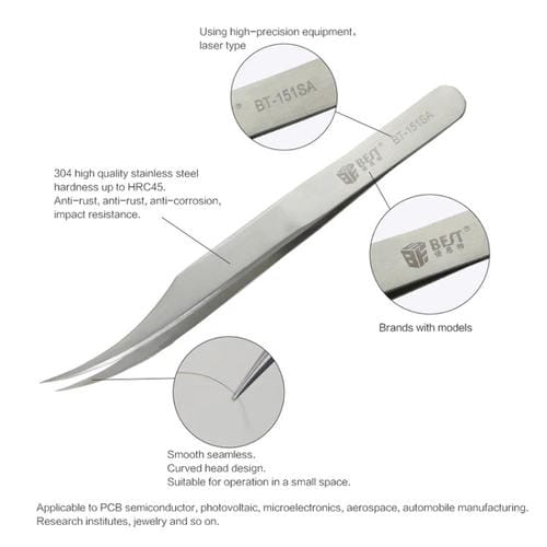 Las pinzas Best BST-151SA están fabricadas en acero inoxidable cepillado de alta calidad, diseñadas para ofrecer precisión y durabilidad en tareas de Reparación. Este modelo es compatible especialmente con dispositivos Acer, aunque su utilidad se extiende a aplicaciones en laboratorios, trabajos de Cuero, hospitales y manejo de sellos. Su estructura anticorrosiva y resistente a ácidos garantiza un rendimiento óptimo incluso tras un uso prolongado. Además, cuentan con un acabado manual pulido que asegura un manejo cómodo y seguro. Estas pinzas son una Herramienta esencial para usuarios que reparan por cuenta propia y profesionales que requieren precisión en sus intervenciones Técnicas.