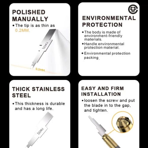 El raspador de reparación LCD multifunción Baku BA-214 es una herramienta profesional diseñada para la eliminación precisa de pegamento en componentes electrónicos, especialmente en Pantallas y CPUs. Compatible con la serie iPhone 12-15, este raspador facilita la reparación y mantenimiento de dispositivos Móviles mediante su hoja de acero inoxidable de 0,2 mm de espesor, que combina robustez y delicadeza para evitar daños en las Piezas internas. Su diseño de hoja única con múltiples bordes permite acceder a diferentes áreas de la Pantalla, optimizando la remoción del Adhesivo en lugares de difícil acceso. Ideal para técnicos y usuarios que reparan por cuenta propia, esta herramienta ofrece precisión y versatilidad en procesos de sustitución y limPieza de Pantallas Táctiles y CPUs.