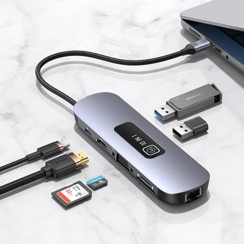 - 10 interfaces: 3x USB 3.0, ranura para Tarjeta SD, ranura para Tarjeta TF, 1x USB Tipo C con PD3.0 (100W), HDMI (3840x2160P/30Hz), VGA (1080P/60Hz), RJ45 Gigabit Ethernet; velocidad de transferencia de datos hasta 5 Gbps; tamaño compacto de 123x43x17mm; peso aproximado de 80g; Cable de Conexión de 15 cm