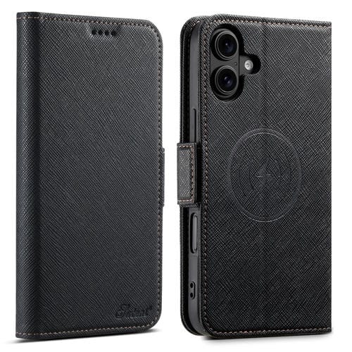 Funda de Cuero Suteni J08 para iPhone 16 con Textura Cruzada y Soporte Magsafe (Negro)