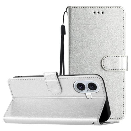 Funda de Cuero con Tapa Horizontal y Textura de Seda para iPhone 16 Plus (Plateada)