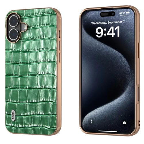 Funda Piel Auténtica Abeel iPhone 16 Plus Textura Cocodrilo Marco Galvanizado (Verde)