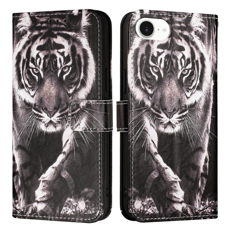 Funda de Cuero para iPhone 16E con Patrón de Dibujo Tigre (Blanco y Negro)