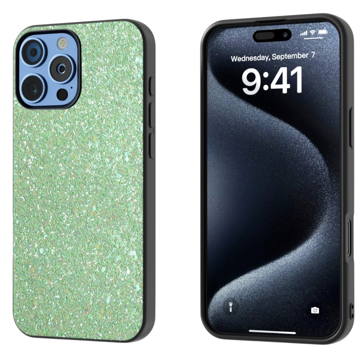 Funda para iPhone 16 Pro Max con Marco Negro y Purpurina de Colores (Verde Claro)