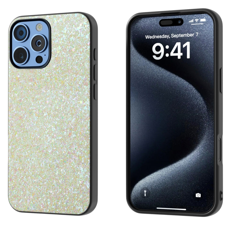 Funda para iPhone 16 Pro Max con Marco Negro y Purpurina de Colores (Blanca)