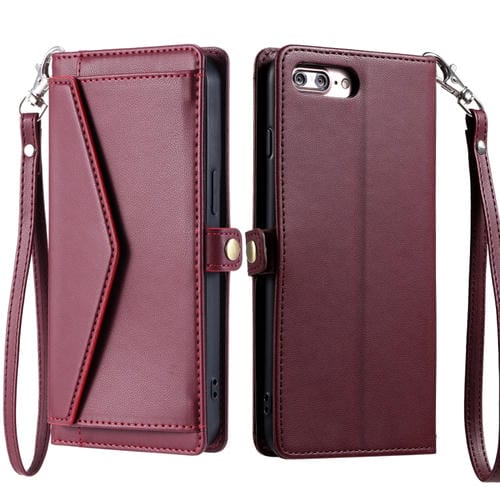Funda de Cuero para iPhone 8 Plus 7 Plus con Ranura para Tarjetas y Cordón (Rojo Vino)